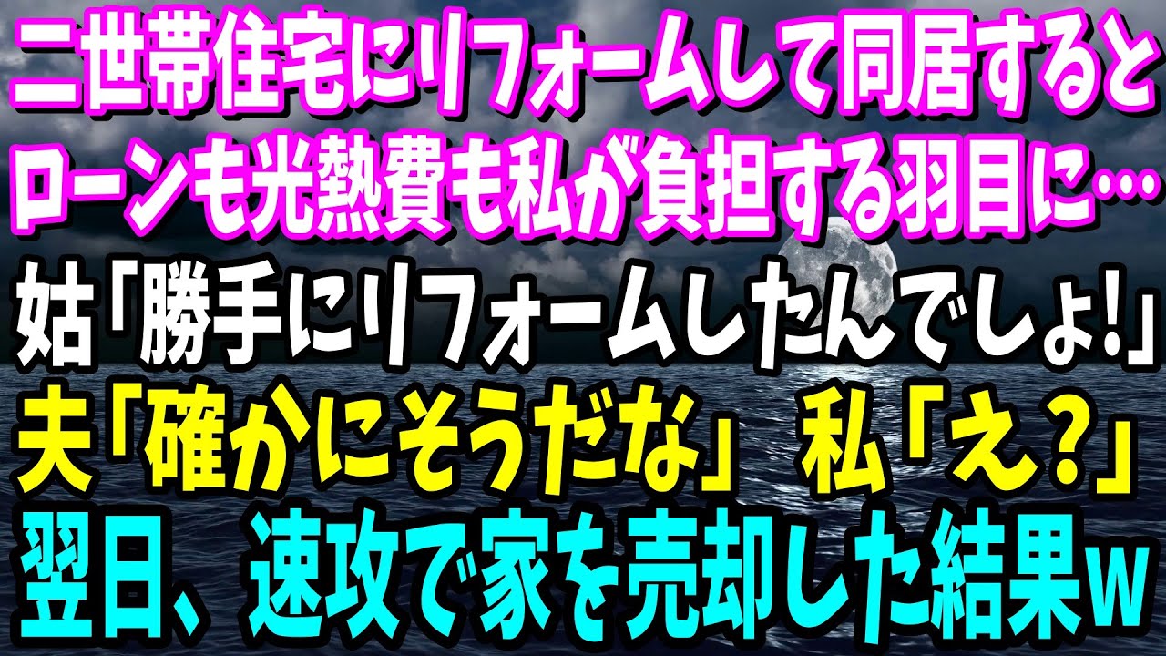 【スカッと】二世帯住宅にリフォームして同居すると、ローンも光熱費も私達が負担する羽目に…姑「あなたが勝手にリフォームしたんでしょ」 夫「そうだな」私「え?」→姑が不服そうなので白紙に戻すとw【修羅場】