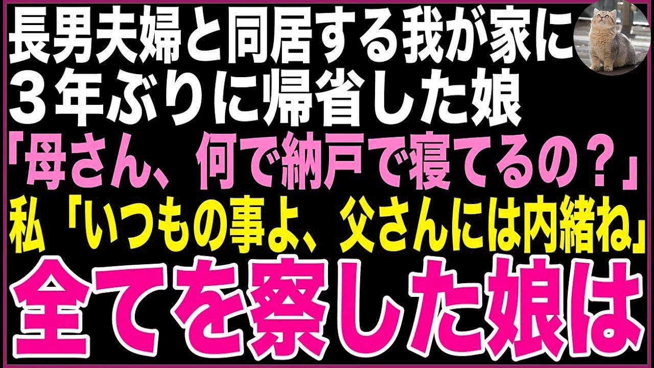 【スカッと】長男夫婦と同居する我が家に3年ぶりに帰省した娘。納戸で蹲って寝る私に「何でこんな所で寝てるの?」私「いつもの事よ、父さんには内緒にしてね、心配するから…」全てを察した娘は…