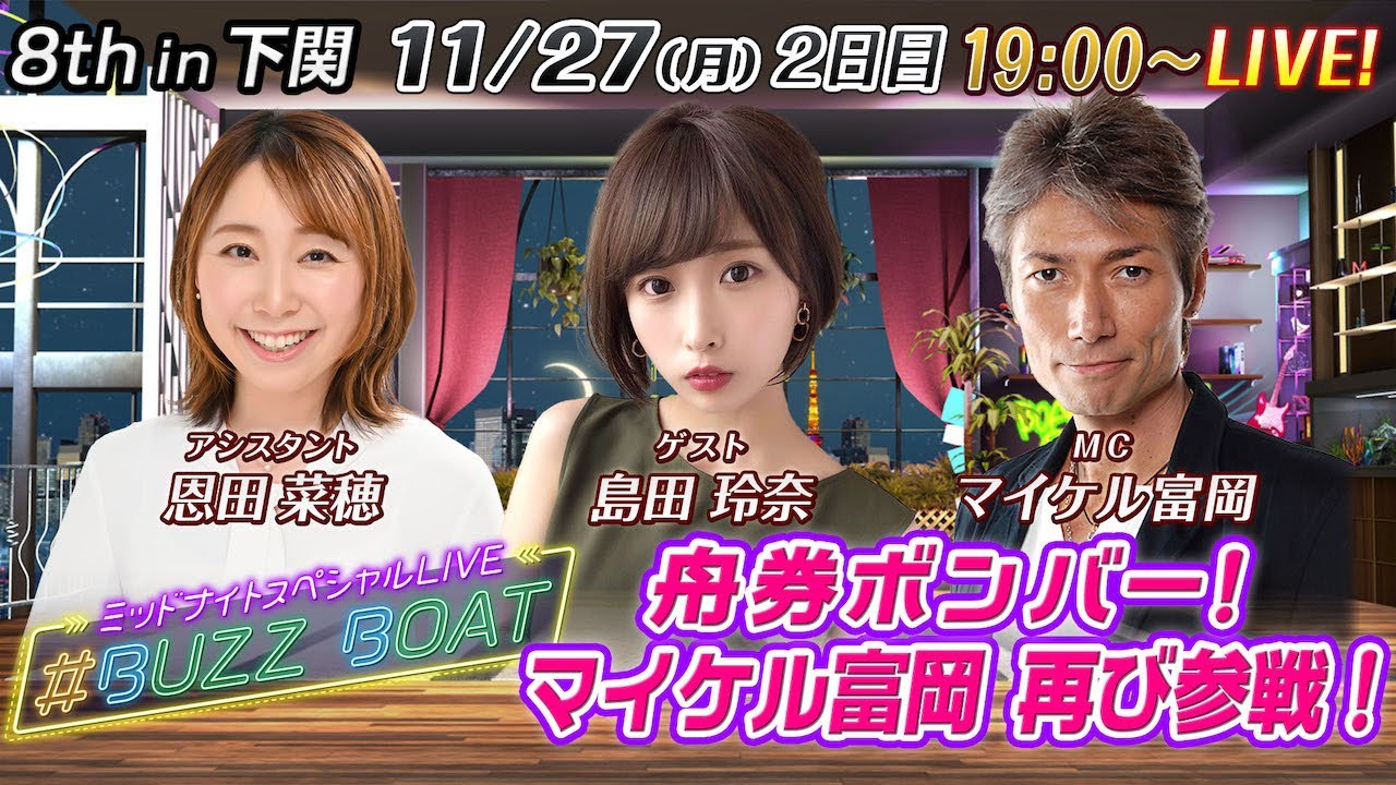 【MCはマイケル富岡!ゲストに島田玲奈が登場!】ミッドナイトボートレース2023!ミッドナイトスペシャルLIVE #BUZZ BOAT11月27日(月)19:00~|ボートレース下関 2日目|