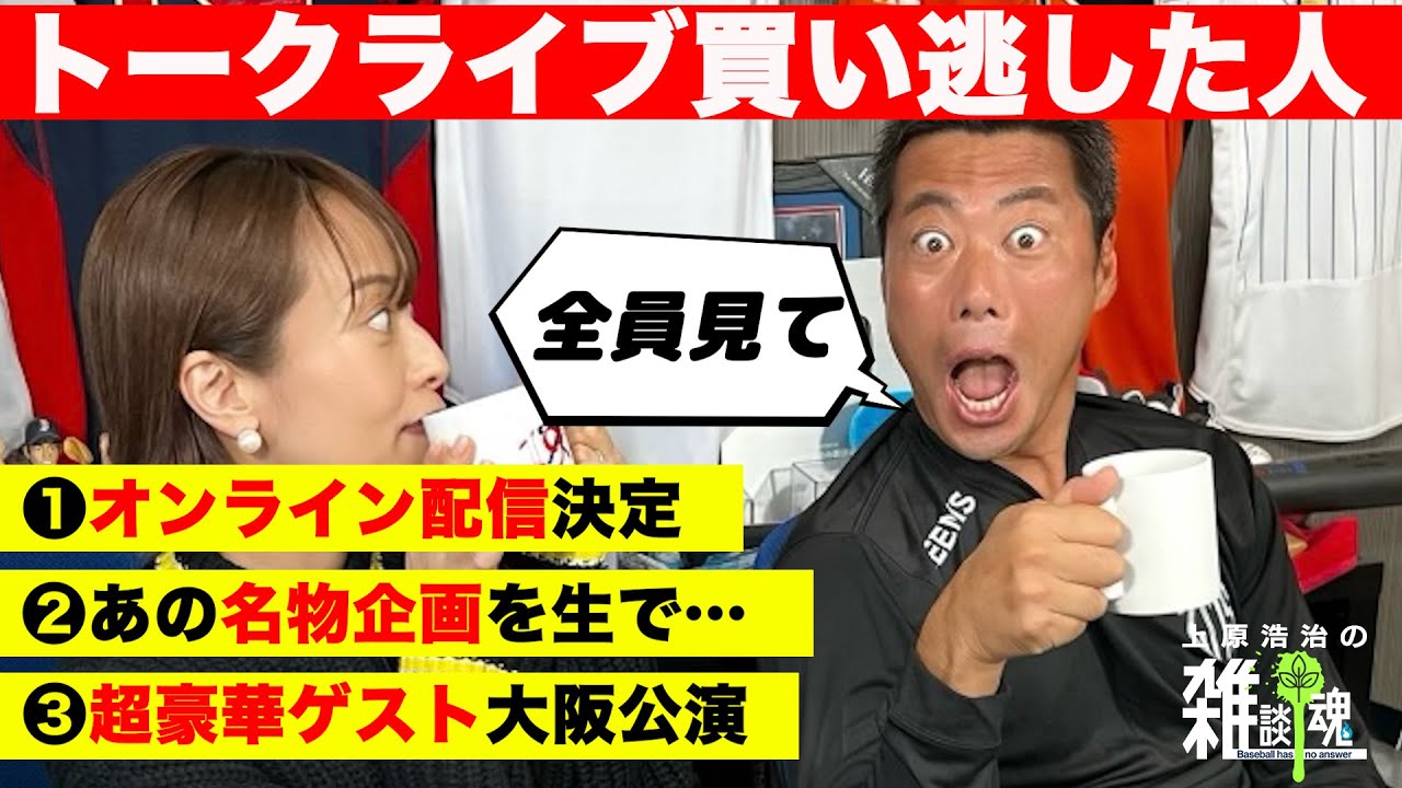 です前のめりだからそうはいはい急上昇 ランク入りましてねはいでも山さんあん時 時間がなかったんだねそうちょっとねあの イベントの後でそう皆さんねあの3回だけ とかってね結構コメントがあるけど やっぱりね相手のの時間っていうのがある からそうそうなんですよそうなんですだ からもう短い中でも本当にたくさんね いろんなお話していただいたんですけどで もやっぱりもうちょっとね時間欲しかった なっていうのもあるので今回またイベント で直接お話を聞きたいですし井川さんは 久しぶりですよねで上原さんと以前2人ね うんねいや井川もね何してるかっていうの ちょっと不思議ちゃんだからね結構そっか 井川さんもあれ2年前出ていただいた動画 が200万再生の動画もああこん時すごい よねで浜中さんですよどんな感じなんだろ うっていうちゃハちゃんでもどんな方です かもハマちゃん俺の中でもも赤い手袋の イメージしかないからああ赤井手袋でさ 東京でも左中間っていうイメージやから ああ対戦した時のイメージはそう嫌なんだ よだから あららららそのちょっとその時のお話もま 出てくるのは間違いないですねはいだだっ て対戦してる人たちだからねこの3人は はいその対戦した時のお話 もしながらあそうですよちょジャ誰か1人 呼ぼうよしかもだって大阪だからうんほぼ 阪神ファンやみんなに上原さんがま地元と はいえ乗り込むみたいなじゃ俺ちょっと 阪神のユニフ来ていく わいいんですかえ味方になってもらわな あらチーム来んじゃいますジャンズの ユニフォーム来ていったらちょっと怖い でしょいやいやいやもうそこはアウでもう 乗り込んでいきましょうよジャンズ19番 のユニフォーム来ていやあこれ楽しみです ね大阪公園いつ1月14日の日曜日です1 月14日はいほ2時の会場で3時開演です 日曜日俺これあれ3デモーニングないんか ありますでも2時え3000モーニングの 生放送してから大阪行くんですか結構 しんどいなえすごいえ最高じゃないですか だってやこれファンからしたらですようん 朝テレビで見た人に午後生で会えるとか めちゃくちゃ興奮すると思うえめっちゃ 興奮します私だったらえねしますよねえし ないあの落ち着け えすごく私だったら興奮するんだけどな しかも東京のスタジオに出てた人が大阪に まで来てくれてみたいななんか是非あの朝 のサンデーモーニングの工事もテレビの 工事も堪能した上で生の工事に会いに来て