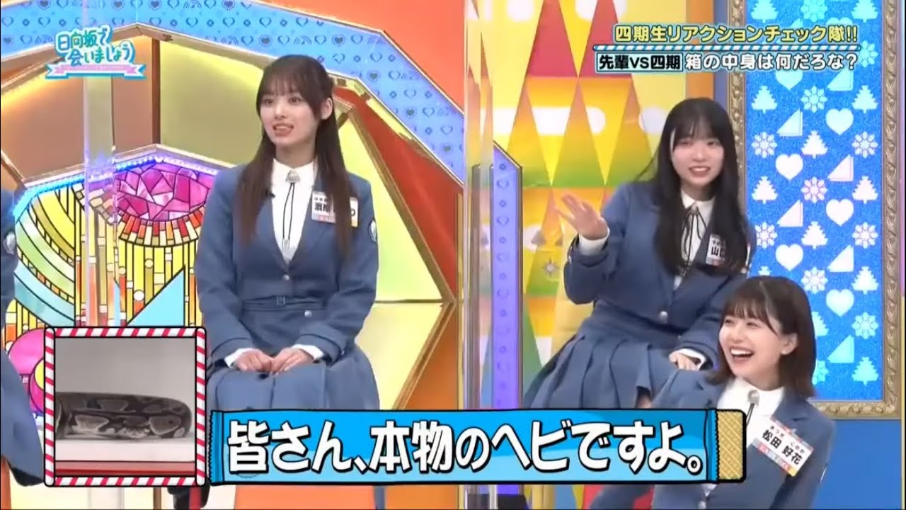 ああ4期制リアクションチェック た第2のちゃを探すべく始まった伝説の リアクションチェック企画いいね前回4規 生たちのうしいピュアリアクションが続出 しか強パセのキュアリアクションが大 暴走そして今回まだまだ隠れていた4期生 の素顔が明かされる果たして第2のニ ちゃんに選ばれるのは誰なのか 坂で会い ましょうこの番組はソニーミュージック とご覧のスポンサーの提供でお送りし ますそれでは箱の中身2回戦竹内とぶ ちゃんの対決から再開ですそれでは2人に 当ててもらう箱の中身はこちらですや [拍手] だマジえどっから持ってきたえ待って反応 すごい [拍手] 誰まあまあまあこれはねばい [拍手] [音楽] やどうしましたドスドス言いましたよ ドスドスドスドス行ったそれやばいなこう やってかねなんなの透かな それではそのドスドスが何だったのか当て ていただき ましょうよいスタートもうほんまになの1 分やねしかし これい るってごめんなさなんかいやいますよね 絶対そうそれいますいないんじゃない の絶対いるやん 下下また本当に何これ 30秒経過 もう ちょいあと20秒いや時間ないようんもう 下の方下の方下の方にね下の方にあるから 下の方にある からあと10 秒大丈夫 すごいすいすごい す 321 [音楽] 終了 上 からで もですか臭は ない続いてピュアリアクションマスターニ の挑戦それでは後半戦はみちゃんの挑戦で ございます [音楽] スタート怖い怖いよ怖いよもうちょいもう ちょもう ちょっと