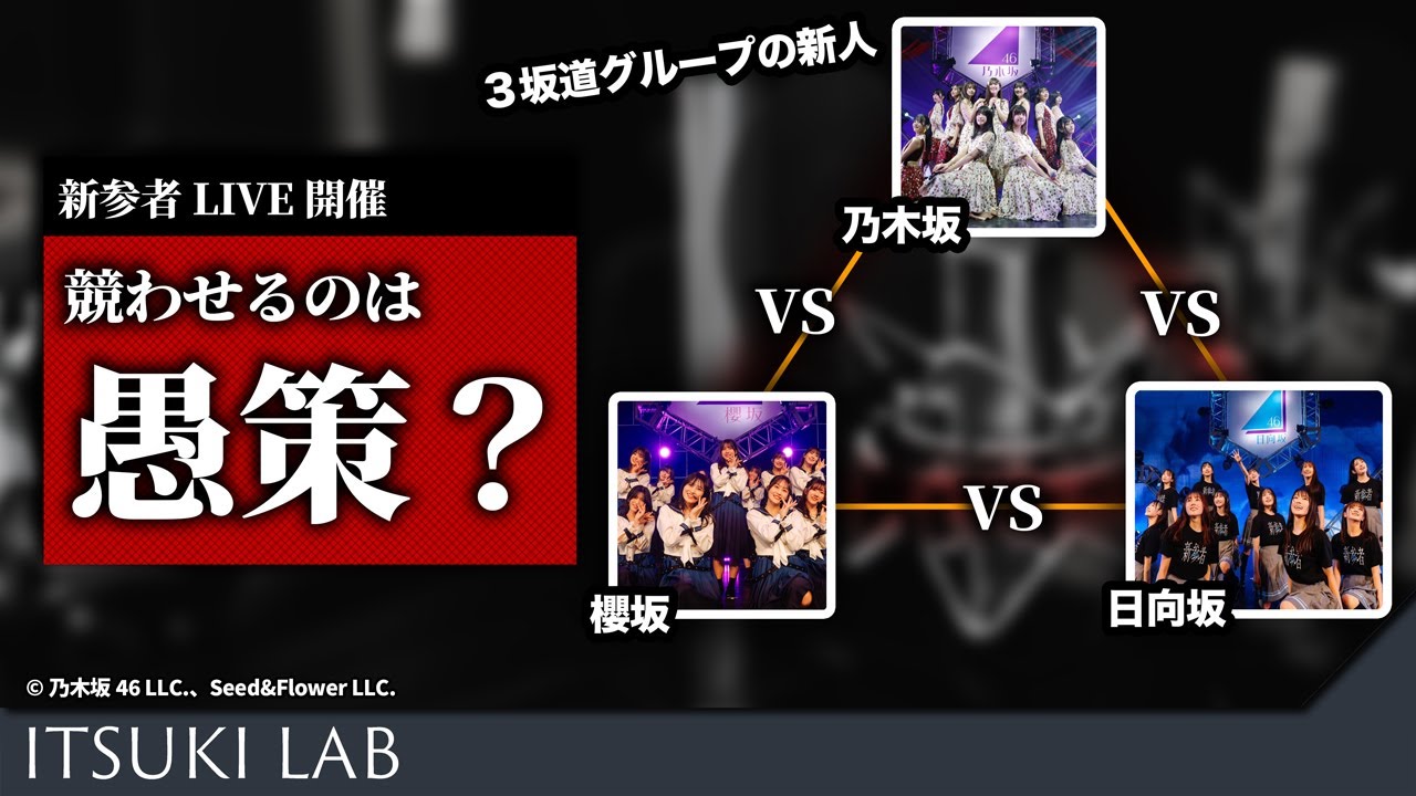 どうもつです今日のテーマはこちらです新 がもライブ開催その先にあるもの先日 こんなニュースがありました乃木坂桜坂 日向坂の新山者がシアタみ座でライブ開催 東急歌舞伎町タワーとコラボ東京新宿に あるシアタミラノ座にて桜シリーズ3 グループの1番後半に当る乃木坂小生桜坂 3期生日向坂4期生が日でライブを行うと いうニュースです2023年11月から 12月の1か月間開催され美座が入居する 東急歌舞伎町タワーではホテルとのコラボ や限定グッズの発売など様々な面での コラボが発表されました坂シリーズの新た な展開を予想させるイベントの開催となっ たわけですがそもそもなぜこのイベントを 開催するに至ったのか気になる部分でも ありますそもそも坂シリーズは元々同じ グループから発生している桜坂と日高が 富士級ハイランドで開催されていたダブル 欅高フェスにてコラボをし続けていた歴史 はありますが乗田とこの2グループの コラボはそこまで多く行われていたもので はありませんにも関わらずここに来て いきなりコラボすることになったのはどう いった事情があったのか分析考察していき たいと思いますこのチャンネルではエンタ 業界で働いていた私がアイドルについての 話題を中心にエンターテイメントに関連 する話題を取り上げユリスをエンタを 楽しんでもらうことを目的に情報を発信し ています面白いと思っていただけましたら 高評価チャンネル登録をよろしくお願い いたしますそれではいきましょうまずはと いう話でしたが今回新山もライブに出演 する乃木坂ご生桜坂3規生日高4規生に ついて簡単にまとめましょうさらっと説明 するので知っているという方は次の チャプターまでスキップしてくださいまず は野坂国生2022年2月1日に加入が 発表され翌日から11名のメンバーが順に YouTubeで紹介されました約9万人 の中から選ばれたメンバーは特に ビジュアルの高さが話題となり乃木坂の 新人らしい話題の集め方を果たしたことが 記憶に新しいです29枚目のシングル アクチュアリーでセンターを務めた中西 アノさん33枚目のシングル1人様天国で センターを含めた井上なさんをはめとして 特徴のあるメンバーが揃った粒揃いの木と 言えるでしょうそして桜坂期生当 チャンネルでは桜坂の話題を扱うことが 多いのでまさらあえて話す必要もないかも しれませんが彼女たちは2023年1月に 11名の合格が発表され翌日から順に動画 でお広げされました彼女たは4万5000