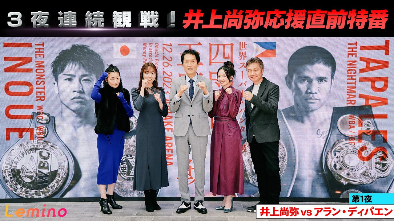 [音楽] 仕事の壁才能の壁世界の 壁誰もが1度はぶつかるその壁を井上尚弥 はいつだって ちやるたくましく完璧に想像を超え て [音楽] その男のおたびは私たちの換気と なるその男の夢は私たちの夢でも ある井上尚弥に夢を 見る12月26日 井上マロンパレスレミで独占無生 歴史的な瞬間が始まろうとしています烈動 とまった異業 達成バンタム級ではやり残したことがなく スーパーバンタム級への挑戦をえ決意し まし たト 左右の カウンターすごいビストレ入ったたこい やっぱり井た [音楽] 僕が持ってるベルトは2本です4体対をし たいと思い [音楽] ます3夜連続井上応援直前 特番さあこの番組ではですね12月26日 にレミーので独占無料生配信されます モンスター井上尚弥選手の世界スーパー バンタム級4団体王座統一戦をより楽しん でいただくために井上選手の過去の試合3 試合をですね3夜連続感染したいと思い ます井上選手の融をもう1度感染しもう 1度語りしていくという番組になっており ますさあというわけでそんな番組のゲスト まずはベッキーですよろしくお願いします お願いし ますさあそしてえ元WBA世界スーパー フェザー級元WBA世界ライト級2階級 制覇王者山典さんですよ願いしますさらに 元ビッシュりんりんことみささんです よろしくお願いしますよろしくお願いし ますさあそしてMCは原と前の進行でお 送りしますよろしくお願い 願なお番組の途中には当日のタパレス戦と の試合を感染するにあたり大変重要なお 知らせがあるのと番組の最後に嬉しいお 知らせがありますので皆さんどうぞお 見逃しなく最後までご視聴くださいそして このライブ番組では随時コメント機能で 井上尚弥選手への応援メッセージを募集し ています皆さんの応援メッセージは井上 尚弥選手にお届けしますので非皆さんの 熱いメッセージを届けてくださいはい よろしくお願いしますお願いしますさあ
