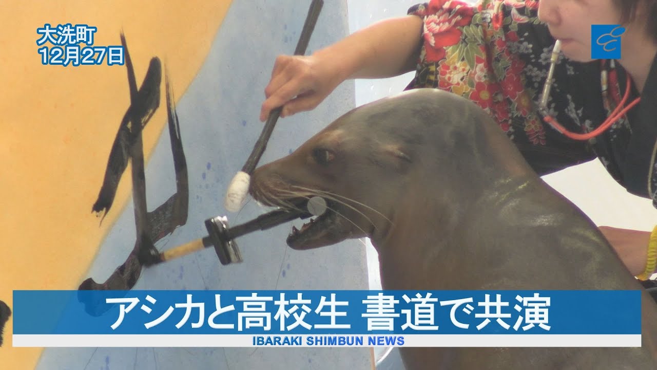 アシカと水戸葵陵高(水戸市千波町)の生徒が共演する書道パフォーマンスが27日、大洗町磯浜町のアクアワールド県大洗水族館で行われた。アシカの「ゴエモン」と「プリン」が生徒と協力し、新年の平和への願いを込めた「世海平和」や「生命」などの文字を揮毫(きごう)した。