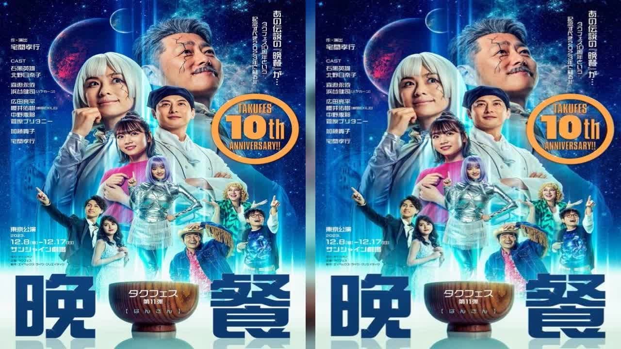 [音楽] 琢磨高幸作演出を手掛けるタクフェスが 10周年を迎え2023年10月より タクフェス第11弾晩餐上演さ れるこの度メインビジュアルが公開となっ たバサはタクフェス第1弾で2013年に 初演をした後1度も再演をしておらず10 周年を記念して満を持たしての 上演舞台は井頭公園に隣接したシェア ハウスイノヘッドそこに60年後の未来 から天才少女が発明したタイムマシンで 幼い頃になくした母に会うためおっさんと おばはんがやって くる自らの身元を伝えることは決して許さ れないため宇宙人や旅芸人として疑われ ながらイノヘットを混乱の渦に巻き込んで いく家族愛をテーマにしたハートフル コメディだ出演は石黒秀夫が父親高槻純二 役北野日子が母親山舞子役を 務める物語のキーとなる少女中野たには森 久井が演じるシェアハウスイノヘッドの 住人としてお笑い芸人浜カ浜屋健二広田 両平が 出演さらに桜井勇樹中野江とフレッシュな 出演者も決定したまた菅原ブリタニーも タクフェスに初出演する未来からやって くるおばハ高槻日子役は加藤貴子 昨演出を手がける琢磨孝幸はおっさん高槻 高太郎役を演じる公開されたメイン ビジュアルは未来感が漂う雰囲気で個性 豊かなシェアハウスイノヘッドの住人が顔 を [音楽] 出すタクフェスバ バックトゥザフューチャーを体現する コミカルなビジュアルとなっている タクフェス第11弾 2023年10月から12月 [音楽] 上演