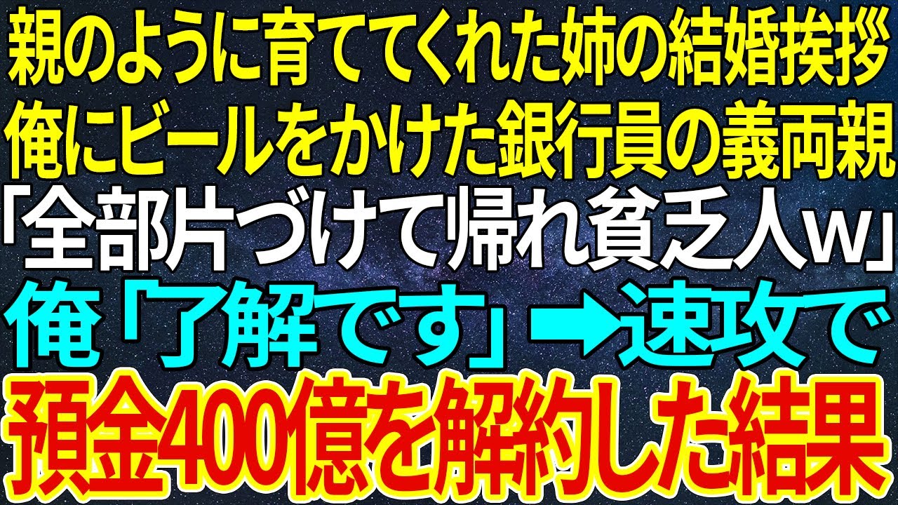 【感動★総集編】親のように育ててくれた姉の結婚挨拶。俺にビールをかけた銀行員の義両親「全部片づけて帰れ貧乏人w」俺「了解です」➡速攻で預金400億を解約した結果【感動する話】