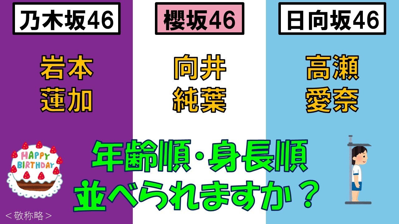 <乃・櫻・日>岩本蓮加さん・向井純葉さん・高瀬愛奈さんを、年齢順と身長順に並べてみた!