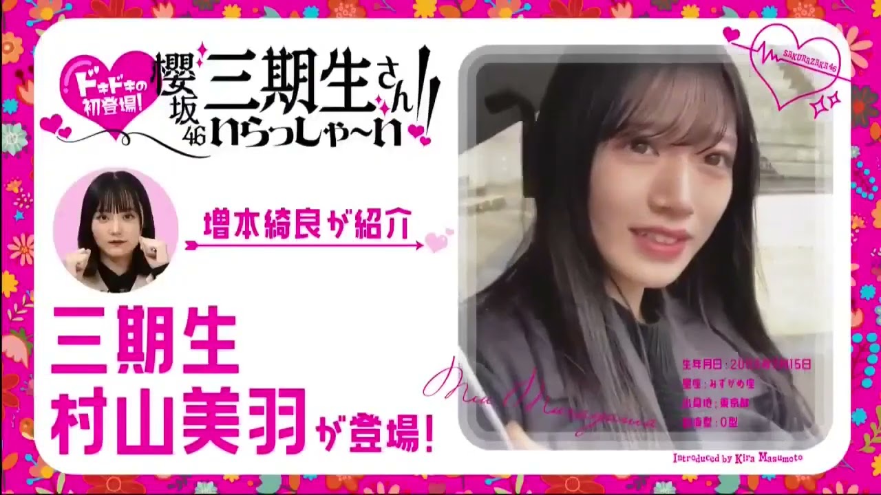 ドリ [音楽] タラタタった 桜坂ついに加入した桜坂463期生 果たして今夜はどんなメンバーが登場する の か今回も先輩メンバーが3期生を紹介して いき ます今週のトップバッターは 果たしてどんな子なの か広島県出身16歳の向かいはちゃん3期 生最年少メンバーの1人でいつも笑顔満点 ちょっぴり泣き虫な一面もあるけれど一生 懸命頑張るけ応援してくんさそれでは登場 していただきましょうあ向いたちゃんです どうぞおさ [拍手] の私 を 頑張れ丈 頑張れ純白な私をあなた色に染めてみませ んか島県出身高校1 年高校1年生16歳 のお願いし [拍手] ますもう歩いてる時から緊張伝わっそう 初期の頃の足もかと思ったも本当うる足何 のどういう涙それは歩き方が分からなくて あだからちょっと緊張しすぎちゃってそう かあの裏でも練習してたんですけど歩く 練習してたかわいい分からなくなっちゃっ ていやいいよこんなういういしいことある ね本当に素晴らしいねいやいいよいいです ねそんな最年少のいはちゃんですけれども 最近初めて1人美容院1人病院1人 ファミレスを体験したそうですおすごい すいすごいきたどうなた1人美容院 エレベーターに乗ったんですけどうん ボタン押すの忘れ たりわからなくて全然動かなくて私全然 美容院つかないつってさんがいつも押して くるたのかからずっとなんか押してくださ いって言われたんですけどなんかわかん なくて押してくださいってどれに言われ です機械あの機械エレベーターに音声の 音声付きのエレベーターにれたんだ白い なんとかあったどいはいそれで美容院って これなか病院ファミレス大変だったでしょ うん病院もファミレスも美容院も同じ日に 行ったので大変な1 日だめだよそれ嵐の1日じゃないなんで その日にそのデビしたのいっぱい私の vlogが公開される日だったのでけじめ をつけようって思っ てそんなうしい再現向にはいつでも膝を