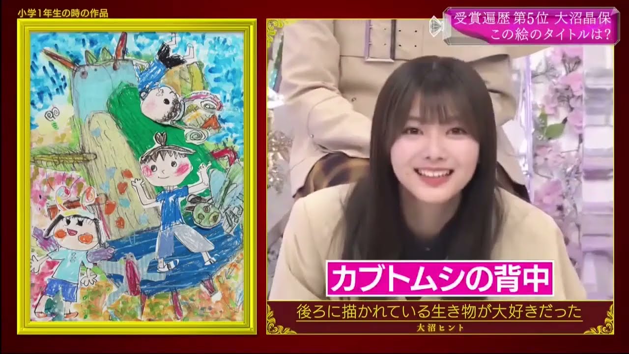 んですよえ小学校3年生の時ってみんな そうだもんねその時期ありましたうんどう いうイメージで書いてのその好きなものを 組み合わせたんですかねああこれタイトル がねあるということではいタイトルご覧 くださいパリゼンヌもびっっくりお寿司も びっくりねこれはやっぱり大沼だね大沼 ですよねうんパリジェンヌはまず びっっくりするよねベルトを下に回転寿司 できたらうんでもお寿司はびっくりだよね 確にお寿司になんか顔あるみたいなのも あるもんねださの時にこんな発想の子い なかったね確かにさらにこちらは大沼が一 の時に描いた作品どんなタイトルだと思い ますか思いついた方から今でお願いします はいまずえ生命の パラダイスいい感じのいやタイトルいい けどいい感じの大沼ですよえ大沼というの を忘れないでくださいそうですね大沼は 覚えてるこのあの背景の生き物のことが 大好きだったんですよ背の物大きいやあ 1番大きいやつ が蝶に乗ってカラフルパラダイス あいいですよ方向性としてはいいですよ なんかいい感まずセミの背中ああ違うセミ でもセミじゃないセミじゃないじゃない のう食カブトムシの背中違う違うじゃ ゴキブの 背中ゴキブが一番近い気がしますゴキブ 近いかもしれないカムの背中カないあと 背中は正解でみんななんとかの背中って 言ってるけどコ のコの遊びそれどうやって遊んでんだろう コの川下り あコのプールああ違う正解はコの滑り台 ですやそこ小一の要素が入ってくじゃない そう滑りて確かにこれめちゃくちゃセンス いいけどねえ本ですかいやマでうまいねて いうかなんだろう発想力がやっぱすごいね すごいはい はいいや発想力だけで生きてきたんですよ いや分かってる本当にあのさあ続いて まいりましょう続いて4位の発表です第4 位 は [拍手] [音楽] 井上 会入内大会入会賞会賞射大会ハッピー賞 ハピー賞めっちゃもらクハピー賞どっち ボルタイどっちボル井上の獲得受賞数はめ 気がする沼より13個 13さんはどうしましたなんかちょっと 微妙なので稼いでませんか違う違う違う 違う違うのやつの漢字の多さに比べて