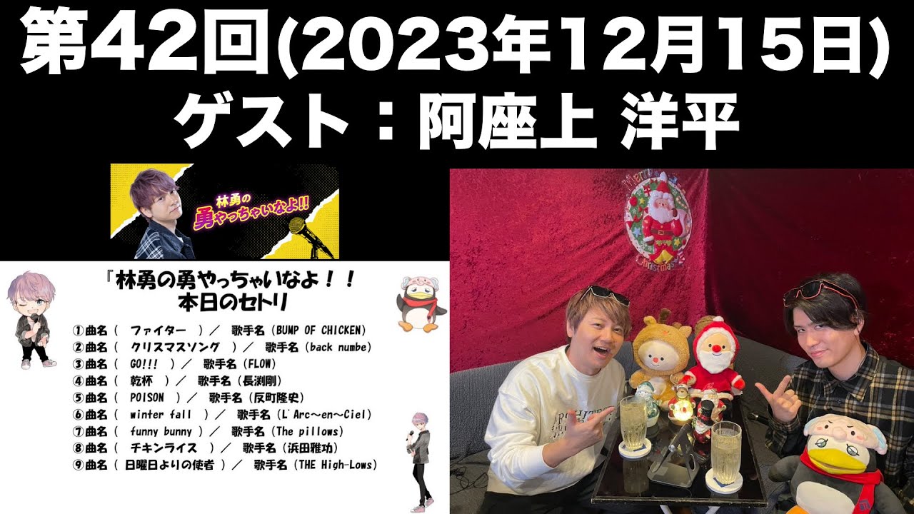 [音楽] はいどうも皆さん こんばんはいかがお過ごしでござい ましょうかなんか音が漏れております けれどもねえ僕の声書き消えてない でしょうかちゃんといますよはいよろしく お願いいたしますさあクリスマスもね結構 近くに迫ってきたんですけど皆さんいう風 にお過ごしでございましょうか俺はね さっきも言ったんだけどねスタッフうちで 話したんだけどねあの親しずを抜かなきゃ いけないんですようんでそれがねあの歯車 に行ったらうんすごい横にめっちゃ埋まっ てるわけですようんだから本当にそこは ちょっと紹介で行った歯医者さんだから 結構設備が整っているとこなんのねだから 抜けるよっていう風に言われたけど普通の 歯医者さんだったら断られるっていうよう なレベルでうん普通のとこじゃ抜けない みたいな感じで埋まってるわけですようん はいそれをね年末に抜こうと思っていて今 から本当にちょっと恐怖を感じているえ ちゃん友でございますうんまあそんな話は どうだっていいよねえもう本当にねえ今日 は素敵なゲストがね来ていただいてるんで さっさとねえ呼ぶところまで行っちゃおう と思いますえ本日もチケ間にご覧いただき ありがとうございますこんばんはチラオケ 官店長のはです本日は月1回の特別営業日 第42回林のゆやっちゃいなよお届けし ますえ店長の私自らえ表なしさせて いただきますそしてこちらにいるのがチラ オケ間のバイトリーダーのファルちゃん ですよろしくよろしくお願いしますファル ぞですまファルちゃんはもう親しないよね えっとね上田でしましたあそうあこんな 感じだけどあるんだおしらずとかね本体 こっっちっていうね謎のなんか設定なんだ けどなんかあるんだねあるあるうんなんか なんか人間と色々となんかごちゃ混ぜに なっちゃってますけどねはい楽しくやらせ ていただきますそはいよじゃあまちょっと ね今日はねあの今あのiPadで見にくく なってるけどちゃんとねこうキャラクター がねいてねクリスマス仕様ではあるわけ ですそうですよねそんなこんなでね クリスマスの歌もなんか歌ってみようかな とかも思っているところでございますさあ たくさんのお手ありありがとうございます Twitterでも皆さんの感想お待ちし ておりますハッシュタグはちゃんゆですえ ちゃんがカタカタゆが林ゆの優の字でえ 送ってくださいよろしくお願いしますエゴ さしますんで はい本日のチラオケ館は前半30分は誰で