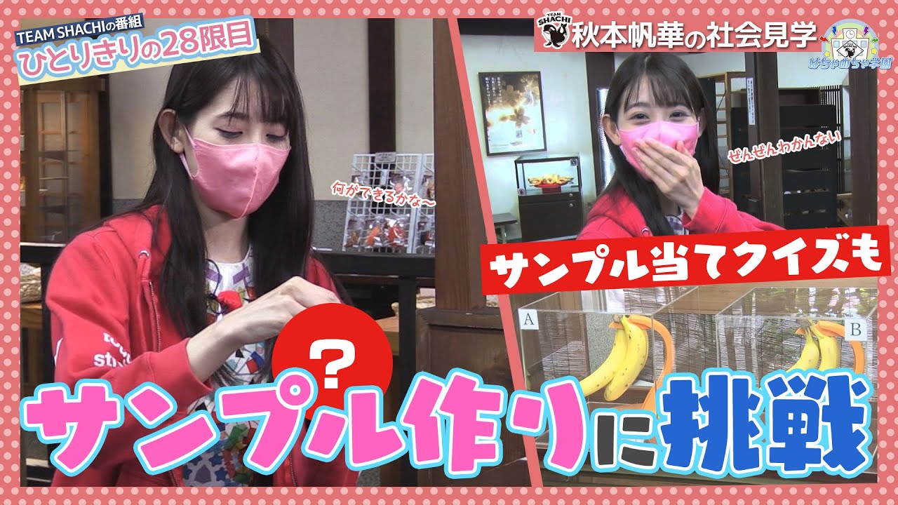 キンコンカンコン どう も今日は28げ目になりますかね秋本ほか です名古屋レートです今回も苦情8万で 色々やっていきたいと思うんですけども その前に今日は12月24日クリスマス イーブイエー きっと君は来 ない1人きりのクリスマスイえ今日も1人 きりなんです長身おらんの寂しい1人きり でえー加害活動じゃないんだよねこれは 社会見学だから何が違うんだまいいやノリ の番組ですしね社会見学今日もしっかり やっていきたいと思います今日は何をやる んでしょう ほ来ました カプセルここに何をやるかが書いてあるん ですよねありがとうござい ますえサンプル作り 体験 へえちょっと何それ目の前でオープニング 取ってんじゃん目の前になんとサンプルコ さがありましたじゃ行ってみましょう お邪魔します失礼しますはいいらっしゃい ませこんにちははいどうもシチの名古屋 レッド秋本ほのかですよろしくお願いし ますすごいですね全部食べられ そうこれなんかもう食べたい食べたいこれ 新しい最近作ったイチゴ大福はいイチゴ 大福のメモスタンドになりますあすごい イチゴに挟んでへえいいな食べたいなんで 武上8万で食品サンプルなんですかはい あのですねまあの武上8万というか具上子 ですね具上子全体で全国のあのま大半を 製造してるような食品サンプルのほとんど をそうですねで作半分でたら結構なシアだ と思いますすごいそれは知らなかったです まああの1番最初にですねあのこの職員 サンプルをまあの本で考えられて全国に 広めた方が武上八幡出身の岩崎さんって方 なんですよそうなんですその方がまあの 故郷ということでま職員サンプルの故郷と はいいう感じでねあの皆さんにご紹介して ます本物とそういうクイズしたら多分 なんか当てられる自信がないんですけどあ そうですかはい今日ねあの体験の方とま そのクイズもご用意してますのでやっやっ やっあのひやってみてくださいやりたい ですお願いします はいじゃあですねまずは今日え本物か偽物 のあのクイズ形式で用意しましたんで1回 見て当ててみてくださいはい当てるぞはい じゃあ開けますねはいはい今日はねバナナ を用意しましたバナナはいえ無理ちょっと 待ってじゃあですねサンプルを当てて