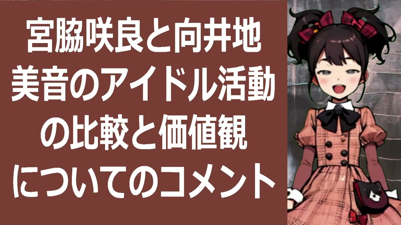 宮脇と向地美のアイドルカトの比較と価値 観についてのコメントを教えてください皆 さん こんにちは今回の動画では48の宮さんと 向地みさんのアイドル活動について企画し て彼女たちの価値観について考えてみたい と思いますまず宮脇さんはどんな魅力を 持っているでしょうか彼女は常にで明るい を披露しフンの心を掴んでいます彼女は 愛らしいエドアは多くの人々に元気を与え 癒しを提供してくれます一向武一峰さは どのようなアイドルでしょうか彼女は パフォーマンスに熱意を落ち力強い歌声で 見します彼女の情熱的なステージは多くの 人々の心をぶり感能を与えてくれます宮脇 さんと峰さんはそれぞれ異なる魅力を持っ ていますが彼女たちの共通点はファンとの つながりを大切にすることです彼女たちは 常にフの声に耳を傾けコミュニケーション を大切にしていますどちらのアイドルも 自分自身を表現することに対して真摯な 姿勢を持っています彼女たちはここの個性 を大切にしファンに対して自分なしさを 伝えています最後に宮ささんと向さんの 価値観について考えてみ ましょう彼女たちは努力や調整を重視し常 に成長を追求しています彼女たちの姿勢は 多くの若者たちに勇気と希望を与えてい ますこのように宮脇桜さんと向三さも それぞれ異なる魅力を落ちながらのファン との繋がりや自己表を大切にする共通って なります彼女たちの活動には多くの人々が 感動し共することができるでしょう皆さん のコメントもお待ちしています宮脇ささん と向地峰さについての意見や感想を教えて ください再生回数が多くなるような コメントの体歓迎です皆さんからの コメントを楽しみにしていますそれでは 次回の動画でお会いしましょう動画をご覧 いただきありがとうございますこの動画が 気に入っていただけましたら是非あなたの コメントもお待ちしていますチャンネル 登録もお願いし ます