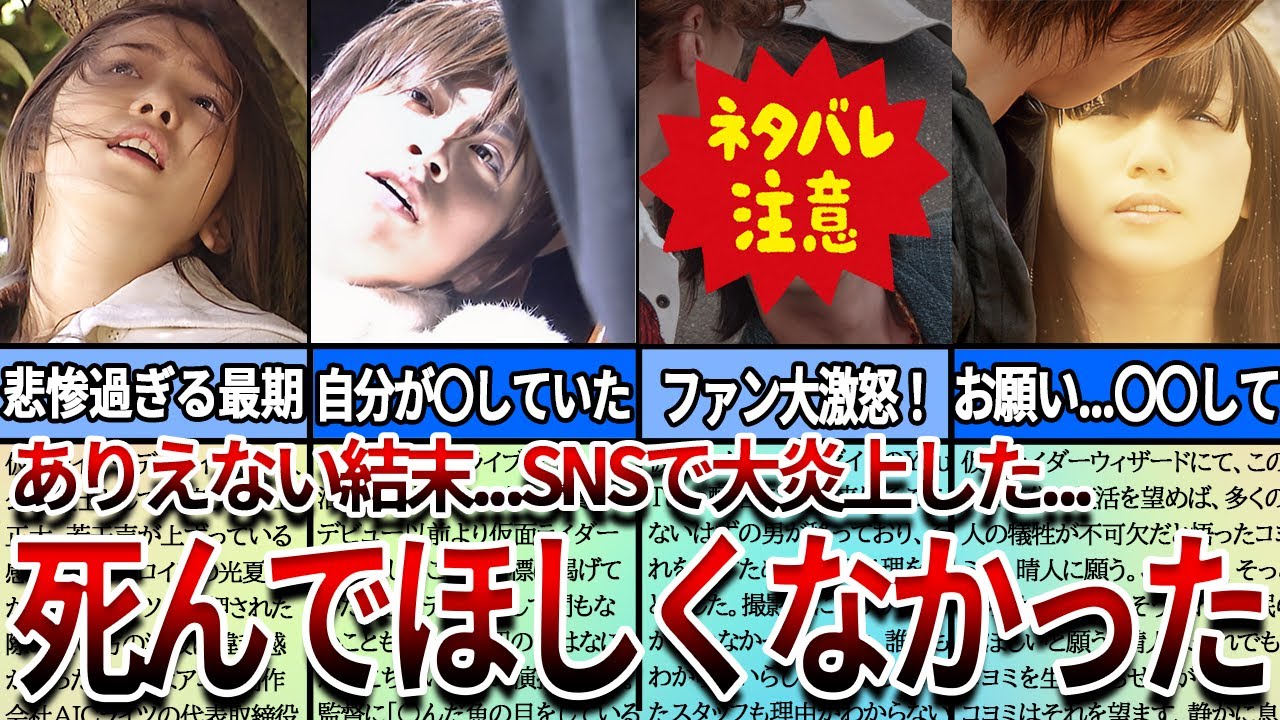 しかし今度はゴーダがが古代オズを撃破し た時に出てきたメダルを欲しがりその力を 手にしてしまうグリードだから圧倒的な力 が欲しくなってしまったのねゴーダの表意 が解かれたエジの元に今度はアンクが表意 して結局ゴーダを打ち破り改めて世界に 平和が訪れるというお話だ結局のところ エジはずっと物語が始まる前から死んで いるということになるのねそうなんだよな 元々エジは本編で目の前の少女を救うこと ができなかったという後悔を抱えたまま 生きていた日のエジの自己犠牲の精神の源 とも言うべき体験よねそうだしかしこの 作品では1人の少女の命を救うことができ ただからエジは満足して死んでいけたと いう落ちなんだがどうにもすっきりしない んだそもそもどうして死ぬ必要があるの かしらそうだよなしかもは基本誰かに表意 されているばかりでエジ本人の出番が ものすごく少ない主役なのにねそれほど 詳しくなくても違和感を感じる描写が多い からファンはかなり複雑な思いだったと 思うぜそうなのね実は今作本編での脚本家 と違う人が書いているというのも批判の1 つの要因になっていると思うんだが人に よってはこれは完結編ではなくパラレル ワールドと言っている人もいるぜうん ファンとしてはすごく複雑 ねというわけで今回は歴代仮面ライダーの 中でも死んで欲しくなかったキャラを紹介 したぜ重要なキャラクターが死を迎えて しまうのはやはり辛いものがあるわね納得 の行くしもあれば納得の行かないしもあっ て結構色々だったわねそうだよな今回紹介 した以外にも死んで欲しくなかったキャラ なんかがいたら是非コメント欄から教えて 欲しいぜというわけで最後までご視聴 ありがとうございました