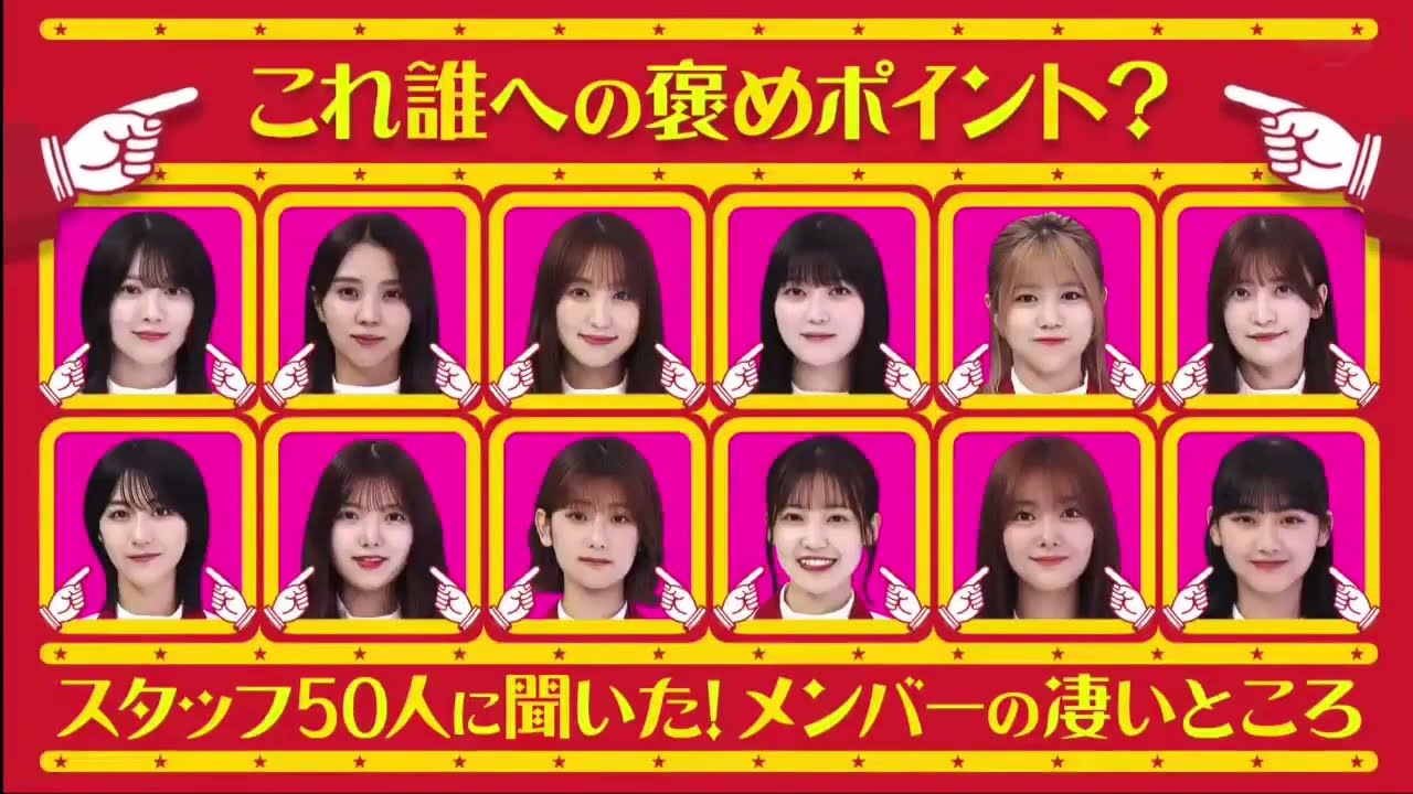 [音楽] そこまったら桜た かさ今週も始まりましたそこ曲がったらさ しかのサトですお願いしますさそして こいつらが桜ちゃん [拍手] [拍手] だせーのそれほどで も今回の企画はメンバー褒め褒め企画それ 私のこと [音楽] [拍手] ですだ以前歌がうまいと絶賛されたまずだ が褒められすぎてうまくリアクションが できないということがそんな褒められべを 今のうちに克服しておこうということで 今回はメンバーのことをよく知る総勢50 名のスタッフにメンバーのすごいところを アンケートその褒ポイントを聞きこれは 自分のことだと思うメンバーには褒を 受け入れ恥ずかしがらず自らどんどん 名乗り出てもらいますすいませんこれ私 ですつって名乗り出てであそこ台あり ますこれ [音楽] [笑い] 私う楽しそう 今日それでは早速参りましょう皆さん どんどん名乗り出てください まず1人目です誰に関する褒めポイントな んでしょうかまず最初の褒めポイントは こちらとにかく [拍手] アイルですからねとにかく可い ね私がなて いうさんさんはうどうだろうな 可愛いよどうアピールする俺は田村え絶対 私だと思います1番けどあんまこう普段 やってたけあんま癖でこんな癖いいなん だろもうなんかしないけどもう引っぱり たいですねなんかヒントもどう具体的に どう可愛いのかとかアンケートありますか ね具体的に ね1個だけじゃうん顔が小さくて可愛いあ これはもう 私あ言われる顔が小さいわ顔小さい顔 小さいしか言われないよ顔小さいしか言わ れないあ じゃちゃんかなもう井上はどうあ井上あで も私テレビ局とか行くとえ小顔です ね誰がテレビ局ったら受の人はいるテレビ 局の案内してくださる方がやっぱり小顔 ですねみたいな言ってくださるんですけど でもでことは全然ないじゃけ行ってみる 小顔いいですかこっち皆さん可いからいけ