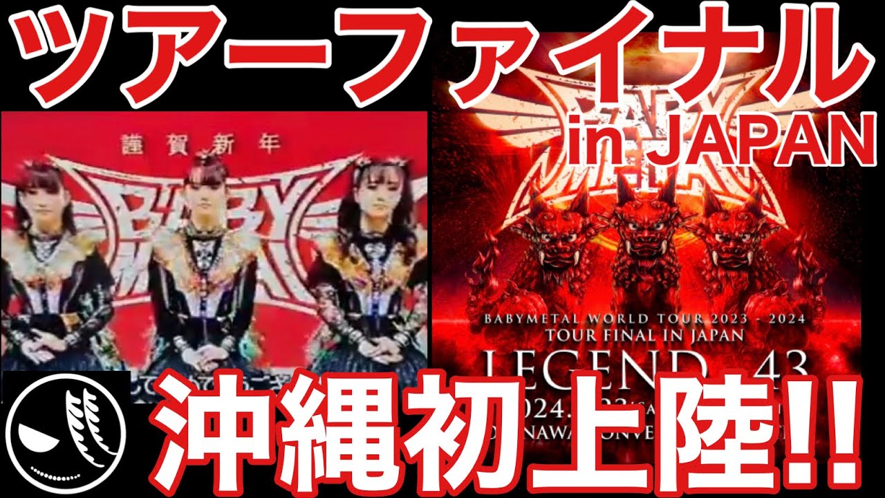 わかん ないっていうえ結論にたきましたなんでか というとね えー私沖縄にいてでかつテレビもつけてた んです けど見てないんですよギア体できてないの で あれ嘘だともでも言えないですよそのおさ 方がねえスメタルさんモアメタルさんもも メタさんのおさ方がねあのみんなでこう ペコリするシーンあるじゃないですかあれ とか今まで見たことないおさ方の動画でし たからこれなんかどっかから持ってきて 合成したっていうには初出の映像すぎるよ なとかねえただそのレジェンドシーサー なんかその時はねカでレジェンドシー サーって書いてあったんでベビメタルが レジェンドシーサーっていうこのタイトル つつけるかなとかねえいうとこ現地にいる のにもパニック状態ですよ全く皆さんと 条件同じっていうねこれどっちなんだ わからんでも生きて生きてつかいるみたい なあのごめんなさい何もできませんでした すごい雑魚だったわけなんですけれども 本日ねえ2024年1月5日にですね正式 に発表になりました本当でし たすごいツアファイナルいつやるのか問題 とかありましたね2024年度なんじゃ ないかとかね私言ってましたけどまある 意味当たりましたねえ3月末にえ正式に 行われるということもう1回ベビーメタル ワールドツア 20232024ツアーファイナルイン JAPANレジェンドシサイン沖縄 コンベンションセンターでございますはい 3月23日と24日2デズに渡ってえ決定 したわけでございますはいえツア ファイナルインJAPANですからこれね というということはですよこれおそらく もう2024年ま始まって5日しか経って ませんけども日本で見られる今年のベビー メタル最後の可能性すらあるというま 分かんないです夏フェスとかねえ喋り ながら今あんのかなと思いましたけどま とりあえずこの一連のねワールドツアーの 終幕の日本バージョンってなるとえイン JAPANじゃないやつはまだまだ続き そうな雰囲気ありますからひとまずこの ライブはねなんとか抑えたいよね言います けれど もどうするみんなどうちますかって感じ これだって3月3月2324ですよ我々は ねレジェンドmmmmって言ってました けどレジェンドmmもとってもてますやん て