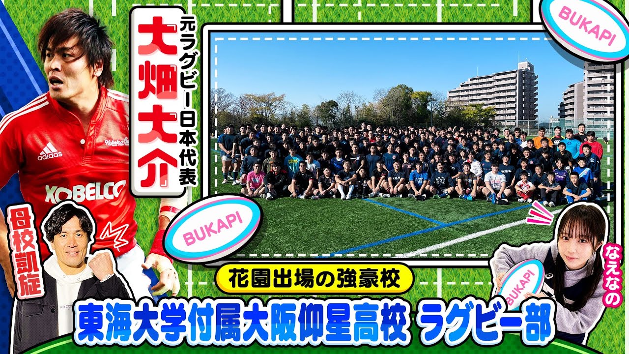 今回のピは花に出場した 校東海大学付属大阪行政高校ラグビー部を [音楽] 特集元日本代表の大大さんがに ラグビ ですめっちゃおるなこれまた増え た ラグビーの飯 もおさんいつも ありがとうピポ [音楽] 全力カピこんちはです新年あけましてお めでとうござい ます初年迎えました か今年の 抱負カンペを読めるようになる噛まない ですめっちゃ噛むんですよもっとね スラスラと読めるようになりたいですさあ 今回はですねラグビーブ特集ということで ブカピ初のあの方がロケに行ってくれまし たVTどうぞ ブカピ大ちゃん初めまして元ラグビー日本 代表の大大輔です初めまして 大畑大好きさんラグビー日本代表として 2度のラグビーワールドカップに出場瞬息 を生かしたプレースタイルでトライを量産 日本ラグビーが世界に誇るトライ王 国際試合トライ数は69トライの世界記録 保持者すごいトライの王 様今回は全国大会に出場する競合校こちら です東海大学付属大阪行政高等学校にやっ てきましたこちらね実は私の母校でして あま1992年にえ全国大会に初場した時 のメンバーでした今回はですねめっちゃ いいね久しぶりにと言いたいんですけど 結構来てるんですよ僕ということもあり ましてまあまああの新しくなった状況だっ たりとかま色々なところをねま改めてお 伝えできる部分もあるんです紹介して くださいま自分自身がね帰ってた時の話で あったりとかまそこからどれだけこう チームが変わってきてそして強くなったの かそして今はねもう全国のもう本当競合校 の1つになりましたんでその強さの秘密 などをね皆さんにお伝えしたいと思います のでよろしくお願 ます東海大学付属大阪行政高等学校 ラグビーを始め柔道や野球などが全国 レベルで有名でプロ野球選手の上原浩司 選手など数多くのスポーツ選手を排出して い ますまこちらがあの校舎になるんです けどこちら校舎です綺麗ですねもうこれは 変わらずです昔から全くま変わってないん だえっとも約何年綺麗なのに40年ぐらい