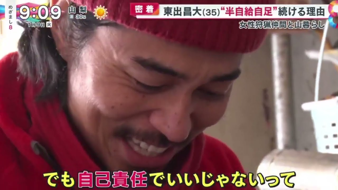 去年1月に目覚ましエトがテレビで初めて 密着取材した俳優東で正弘さんの反自給 自足の生活あれからおよそ1年年末年始に 番組が訪れると3人の女性と山暮らしを する東出さんの姿がありまし た 321 [拍手] [音楽] ハッピー賑やかな年越しその中心にいたの は俳優の東出正さん35 歳スキャンダルを経て山暮らしをする東 さん新たに女性の狩猟仲間も加わってい ましたちょっとなんか前髪が前髪 ちゃんとないでくさい怒ってる のを離れ山に生活の拠点を移しておよそ2 年理て最近では実業家の西村行さんと アフリカを横断したバラエティ番組が SNSで累計1億回以上再生されるなど 活躍の幅が広がってい ます僕の生活を24時間365日見てたら いやまこなんか人間なんだねでも大して 魅力的でもないねって思われるぐらいの 人間だと思ってるので一一はしないかな もう取材で見えたのはこれまで明かされる ことがなかった暮らしの変化と心のうでし たし願東ですよろしくお願いし ます目覚まし8が初めて東さんの元を訪れ たのは去年1 月 斧を振って麻痺を割りガスのない生活を 送る様子 [拍手] や自ら山に分け入り狩猟で得た地肉を食料 とするなど反自給時速の生活を取材しまし たあれからおよそ1 年 再び東出さんの元を尋ねまし た失礼し ますどうぞあどうもこんにちは目です こんちはおはようございますお久しぶり ですどうもお久しぶりですおはようござい ます ます東今は何をされてたんですか今朝食 終わってで片付けちょっと今もこの軒下で されてるまそうですねま以前取材して いただいた時の小屋もう順調にぼちぼち 出来上がりそうなんです [笑い] けど風強い今日カンパらしいですね まあまあ大丈夫 痛い 痛い愛犬のしちゃんとの軒下 ぐらし以前と変わらず山から引いた水を 使い巻でにする生活を送ってい