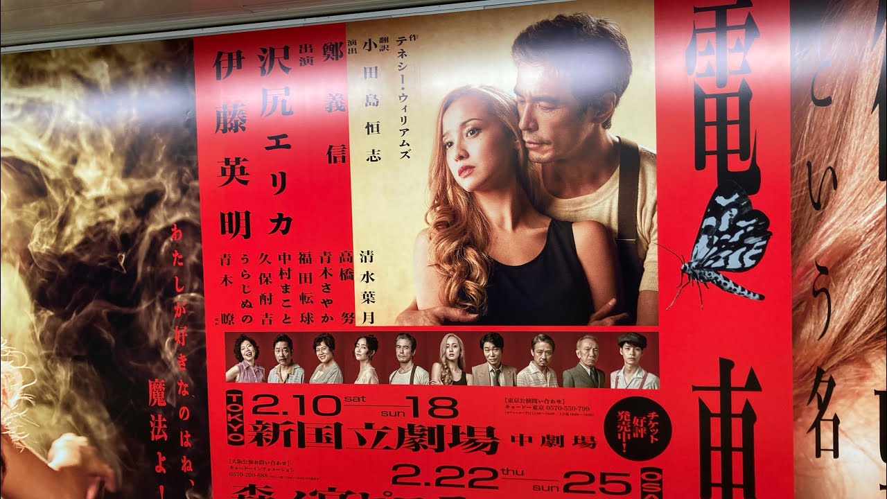 おはようございます久井ですえ今日は1月 6日のえ土曜日早朝のいつもの新宿駅の 地下鉄の通路でございますえっとね沢尻 江莉香さんと伊藤秀明さん終演のえ欲望と いう名の電車のえ舞台の広告がえ壁一面に 壁紙でこうびっしりと打たれております えっとね向かって左からねえこれなんか 劇中のセリフが書いてあるっぽいんです けど向かって左からこう読んでいくとあの なんかこうスストーリーっぽくなってる ようなうん感じに感じがしましたえあの ちゃんとしたお話はごめんなさい知らない んですけど有名なタイトルね有名な タイトルなんでえあとサジエリカさって ほらデビューの頃からすごく演技には定評 があってねあの評判良かったと思うんです けどうんま色々ありましてねなのでえ え大体的な広告垂れてます是非ぜひM