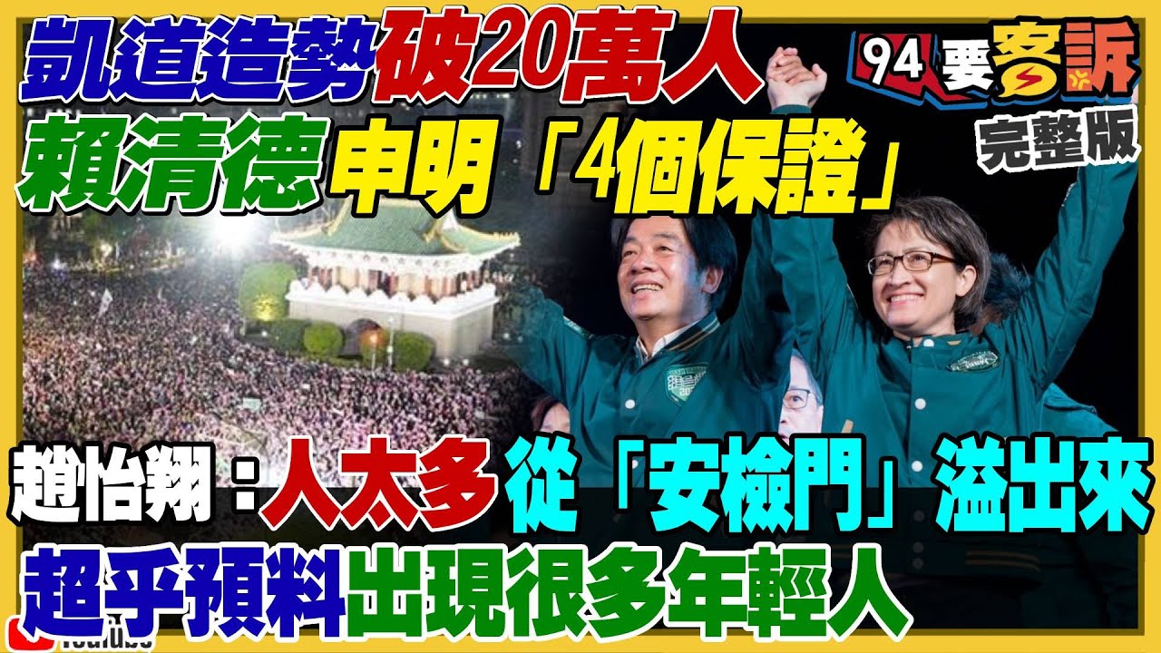凱道造勢破20萬人!賴清德申明「4個保證」!蔡英文要選民再信他一次挺賴!馬英九被國民黨拒上選前之夜!柯文哲想要選後綠白聯合政府?搶救義川大兵+苗博雅衝高立委票【94要客訴】2024.01.12