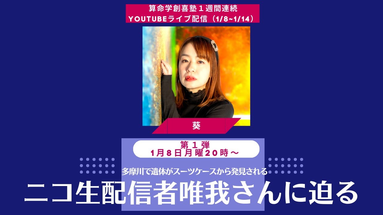 かっていうのをねまずちょっと一緒に さらっていきましょうということでね こちら ですはい皆さんちょっとこれ以上大きく ならないんでよろしくお願いしますえ川崎 市の多摩川で見つかったスーツケースの中 から住所職業不定の原田さん46歳の遺体 が見つかったとでトランクケースの中に 入ってたんですよねで調査の結果から首を 閉められたことによる窒息死が死因である と遺体は手足を折り曲げられ死後数日が 経った状態であったということなんですね でま犯人は確定されていないんですけれど もね彼はニコ生配信者だったっていうこと でまYouTubertiktokでも あったんですけれどもで私全く知らなかっ たんでちょっと調べましたけどま YouTubeはえチャンネル登録者が 3610人tiktokが1629人と いうことで多分でもニコ生っていうことは もうちょっと前からね配信活動はしてたん じゃないかなって思うんですよねとにかく あのなんだろう芸能人じゃないんで Wikipediaがないんですよ ウキペディアがないからいつから始めて何 をどんなことをされてとかま逮捕歴って いうのがねこっから出てくるんです けど実はね逮捕歴がある方なんですよで 配信者としてね活動してるえユガさんです が過去の逮捕歴は22回と公表しており 波乱万丈の経験を積んできたっていうこと なんですよねでその罪の内容って言うん ですかがえ窃盗感脅迫薬物っていうことで まかなりの犯罪に手を染めてきたっていう なのでまこういうね あの方なんですよでで私も何を配信されて たのかは全くわからないんですけどでも とにかく あの ねスーツケースに入れられて玉川に捨て られるっていう亡くなり方ってちょっとま 普通じゃないですよね普通じゃないって いうことでまこの方がどんなことなんだろ うっていうことでま今回やることになった んですけれどもね はい原たゆさんえ1977年5月12日 生まれということでまあ今回ねまなぜ殺さ れたかもまだ犯人っていうのも全くまだえ 事件がねその年末だったでしょうまあ4日 5日6日経ってますけどま犯人は見つかっ ていないということでま全く情報はないん でえまとにかく今回は三名学の視点からま ゆかさんっていう方がどういう人物なの かっていうのを見ていきたいと思います はいさあ名識この青年月日の名識私ねため