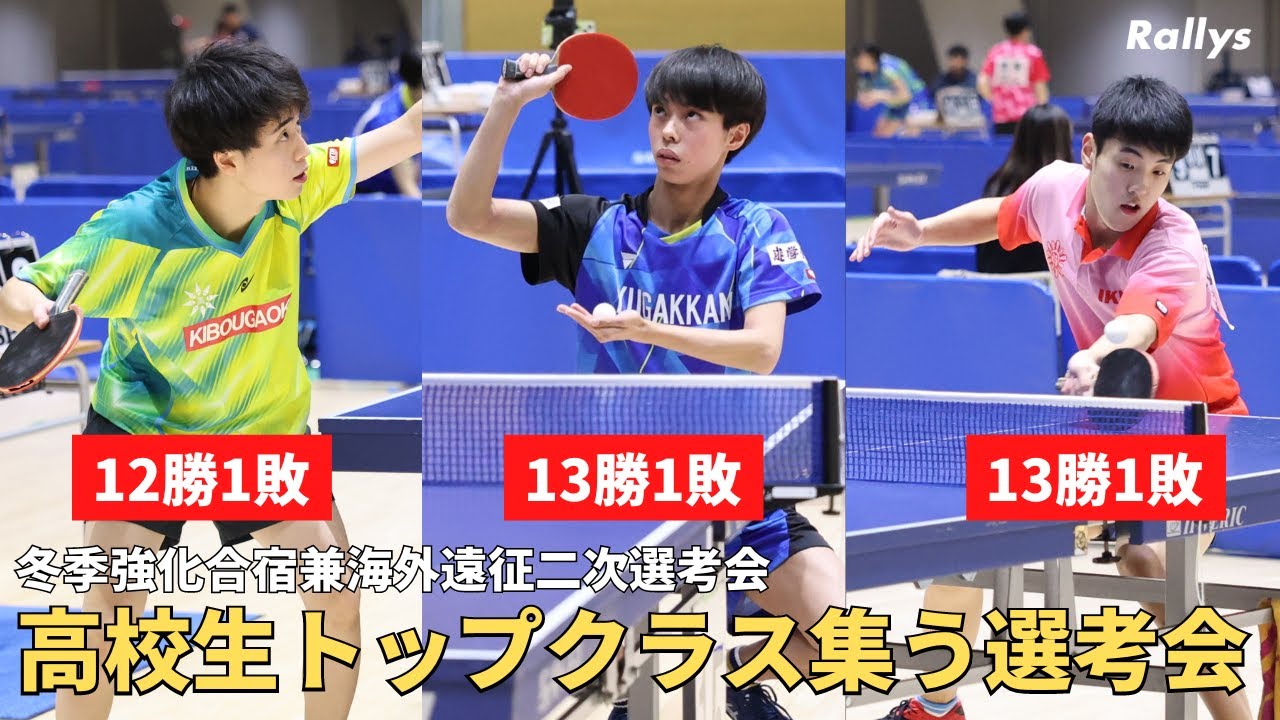 R皆さんあけましておめでとうございます 今年もどうぞよろしくお願いいたします ラリーズ編集部の山下です2024年の 取材はめとして青森県で行われている 高体連の当期強化合宿県海外遠征2次戦 公開に来ていますインターハ上位選手や 新人合宿の上位選手開薦の選手の男女各 44人ずが参加し14人または15人で 総当たりのリーグ戦を行いその後順位決定 の決勝リーグが行われるという長丁場の 強化合宿となっています上位に入ると海外 遠征につがる春合宿参加の権利が得られる ため年始から熱い戦いが繰り広げられてい ました今回の動画では男女予選リーグの 結果とプレイダイジェストをお届けし ます 男子Aリーグは1位が12勝1敗で 希望が丘が雲選手2位が11勝2敗で愛光 大明電菅沼 選手男子Bリーグは1位が13勝1敗で 遊学間正選手2位が同じく13勝1敗の 出雲北領小野 選手男子Cリーグは1位が13勝1敗で行 A谷本選手2位が同じく13勝1敗の遊学 館鈴木選手となってい ます女子Aリーグでは1位が13勝敗で リベルテ上沢 選手2位が11勝2敗で四天王寺山本 選手女子Bリーグは1位が13勝1敗で歩 大みほ有佐 選手2位が12勝2敗で横浜斗島村 選手Cリーグは1位が13勝1敗で リベルテ吉本選手2位が12勝2敗で横浜 斗日山選手となってい ます各リーグの順位を元に全体の順位決定 の決勝リーグが行われており7日には全 順位が出揃いますハイレベルな戦いを 勝ち抜き上位に食い込むのはどの選手なの か非常に楽しみですそれではお待ちかねの プレーをどうぞ今所属している大学3年生 の方で仕事も卓球も頑張りたい方に朗報 ですケアリッツ&パートナーズが卓球部に 所属している学生の新卒採用エントリーを 受け付けています慶王技術大学卓球部出身 の宮本社長のも卓球経験者がマネジメント 層にどんどん出世していますエントリー するとオンラインでも開催される説明会に 参加できますので少しでも興味のある方は 概要欄やコメント欄の採用ページからお 気軽にエントリーしてみて [拍手] ください [拍手] kom [拍手]
