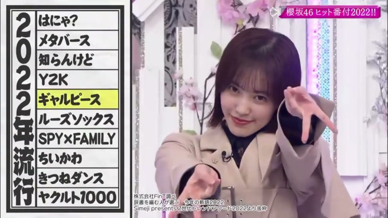 [音楽] そこまったら 桜坂さ今週も始まりましたそこまかったら 桜坂しかりのサートですお願いしますさあ そしてこいつらが桜ちゃん [拍手] だ ブムブム ブブさあそれでは今回の企画発表いたし ます今回は桜坂46ヒットバ付け 20202ヒヒットヒットヒットんだろ これ2022年もあとわずかということで ございまして今年はま世間でこう色々な もの流行流行ったじゃないですかなんかは にゃーとか ね そんな めゃ 気流行りましたよねギャルピースギャル ピースってこおライブとかでめっちゃあり ますありますありますめっちゃ見ます 最近そこで今回は世間の流行とは別に桜坂 46内でヒットしたものを番付け形式で 発表グループ全体で代替的にヒットした ものまたまた超極地的にヒットしたものを 掘り下げていきたいと思 だから本当も今年た内輪のことでしょそう いうことですなのでちょっと内すぎるな これはテレビにちょっときついなってなっ たらさんそちらにあこれはいベロあります でこれでも強制終了で次のネタにらんけど 行かせていただきます早速参りましょう 前頭から発表ですほら桜坂46ヒットバ 2022みたいねまずは前頭から 発表西前頭4枚 目乾杯の ポーズ東前頭4枚 目オーバーチオおばあちゃんオーバーお ばあちゃん西前頭3枚 目小池に思って もらうすいのって東前頭3枚 目バレバレ 隠れんぼに選出されましたえまずは西前頭 4枚目ですね乾杯のポーズこれは大園はい ちゃん大なんですね乾杯のポーズ私と森田 の間でもう鬼流行りしましたお2人の間で ちょっと待っえ周りの人は知らないんです か知ら知らない2人のお仕事の間でなんか 怒ったノりだったのでなんか伝わらなくっ て2人の間でずっと流行ってましたもう 半年ぐらい引きずってて今も もずっと乾杯のポーズってのがあるわけね なんか杯いや本当ただの乾杯なんですけど 何なんですかただ乾杯してるだなんですよ 2人で2人でキャッキャですライブでも