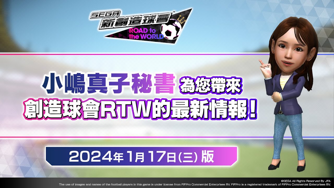 創造球會的新人秘書小嶋真子將為您帶來『SEGA新創造球會 ROAD to the WORLD』的1月17日改版最新情報!