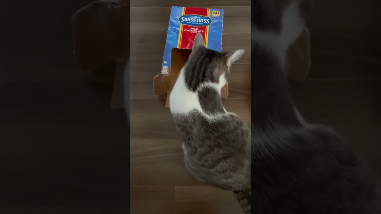 コストコで買ったスイスミスのココアを飲みきったので箱で遊んでいただきました おいしかったです アッシュくんはかわいいです