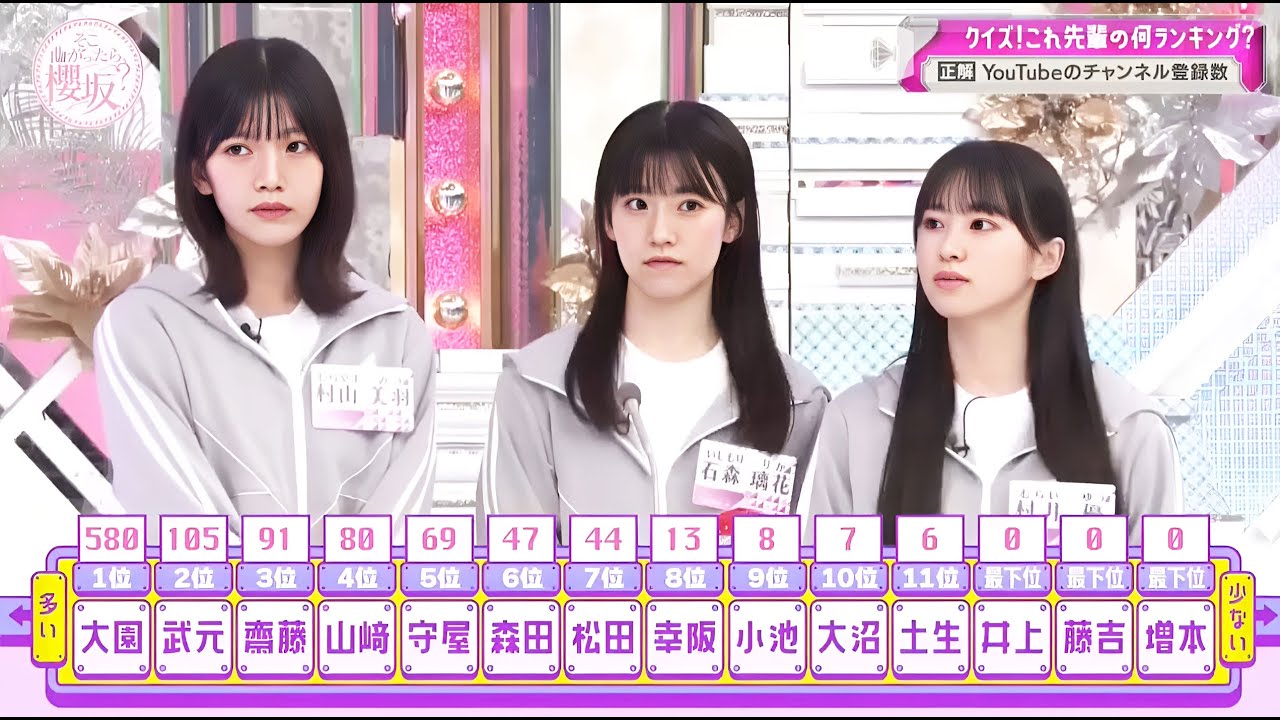 そこ曲がったら 桜坂さ今週も始まりましたそこ曲がったら 桜坂司会のサートですお願いしさあそして こちらがさちゃん [拍手] だせーの ランキングランキングだけみたい 今回の企画はクイズ分かって当然これ先輩 の何 ランキング3期生が加入して早や6ヶ月 ツアーにも参加し先輩との距離はかなり 縮まってきたはずそこ で今回は先輩のことをどれだけ理解できて いるのかお試すクイズに挑戦してもらい ます問題は先輩たちがある数を元にした 順番に並びますそれを見て一体何の ランキングなのかを当ててもらいますだっ て元々加入する前から先輩方のことよく 知ってるわけですっそれで入ってきて なおさら知ったわけですからそういうこと でございます自信あるでしょ谷口とかま さすがに外さないでしょそうですねこの ツアを通していろんな一面も知れたかなと 思うので大丈夫だと思いますま大丈夫 でしょねおらね当たり前というテンション ですんでもし3期生間違ったら人生初めて の罰ゲームを食らっていただきますいや ええて言うだって別にほら間違えなきゃ いいんだからそうそう簡単簡単それでは まず第1 問第1問目のランキングこちらです3期制 振り返って くださいさあこういうランキングとなって おりますはいはい多い人から少ない人はい 多本少ないこのランキング果たして何の ランキングでしょうか分かった方早し どうぞ早はい持ってる文房具の数持ってる 文房具の小学校の学級新聞のランキング じゃないえ文目じゃないはいた親戚の 数戚の数じゃないそんなの並べてパって見 てわかんでしそうですよねさ来たどうぞ足 の大きさ足のそんなことないよそんなこと ないよゾノ28cmぐらいだっけ8cmも ないですけどさあ出ないかはい持ってる ハンガの多さあいいねああいいねハガて ことはイコール洋服多く持ってるってこと だっ持ちみたいだねうんそういうだから 広がりを考えましょうねテレビとし てランキングならほら広がり広がりを 感じる答えをお願いします頑張れ頑張れ 嫌いな食べ物の 数 かいかい確そんなに多いのと松田が やっぱり中間ありにいますねやっぱりねい 松田は何やって
