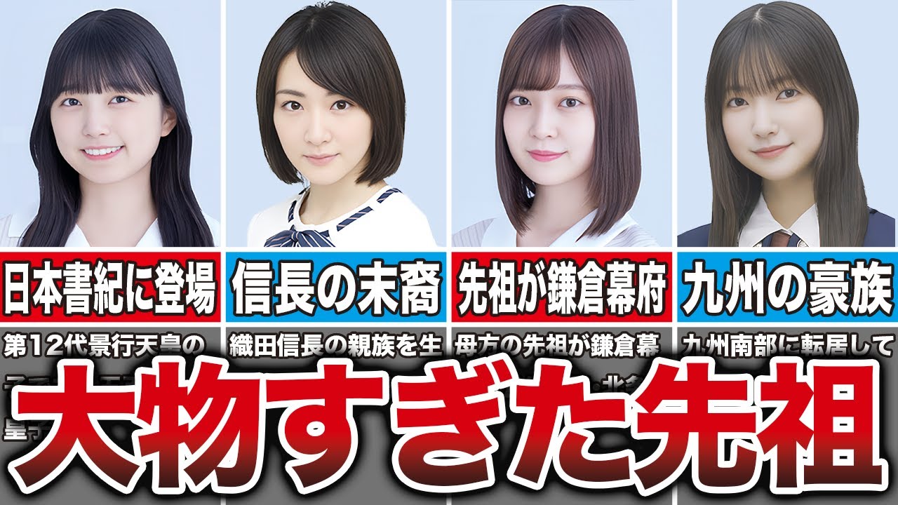 坂道グループの中には先祖が歴史上の大物 であったり親族が昔の著名な人物であると されているメンバーがいます先祖が歴史の 教科書に乗りような誰もが知る人物であっ たり苗字は出身地から歴史的に非常に重要 な地筋であると言われるメンバーがいます 中には織田信長の松江なのではないかと 言われるメンバーもいるのだから驚きです 今回は先祖親族が歴史上の大物だった坂道 メンバー10人を紹介していきますまた 坂道グループが好きな方は是非チャンネル 登録をよろしくお願いします坂口 乃木坂の3期生の坂口玉美さんは自身の 先祖が鎌倉幕府第5代失権北条時折りだと 明かしています乃木坂の冠番組乃木坂工事 中の企画BQニュースにてその事実のみ 発表していましたが坂口さんのトーク パートは放送上はカットされていたようで 詳しい内容や真相に関しては明かされてい ませんでしたその発表から約1年後坂口 さんがショールームでの配信番組乃を担当 した際にこの自身の先祖の件について説明 し改めて母博の先祖が北条時折りである ことを話していましたその事実に加えて 坂口さんのひじいさんの台まで名前に全員 時という字がついていたことも明かし 改めてファンを驚かせましたただ坂口さん 本人も母親からこの事実を聞かされただけ で詳しいことはよく分かっておらず特に 実感はないそうですおっとりとした性格の 坂口さんらしい反応でとてもほっこりし ますがもし事実であればBQニュースでは なく永久ニュースですねいつか詳しい内容 や詳細が解明される機会が来ることを 楽しみにしですね小原 次子日向坂の4規生として加入した小原 次子さんはその珍しい苗字に注目が集まり 先祖は歴史的にも大物だったのではと言わ れています小原寺という苗字はひし大社の 鮭であるハフリベのスを祖先とし代々ひし 大社の神主を務める一族だとされています 天台州の自社である小原寺の豪が変化した と言われる古い家計でさらに遡れば家長明 がいる家あ主の家計までたどり着くとも 言われておりとても古くからある勇正しき せいであるとされているのです小寺さんの 可愛らしい顔立ちながらもどこかリとして 清らかな雰囲気は勇し正しき血筋から来て いるものなのかもしれません日坂4期生の エース候補として期待されている小原寺 さんですが珍しい苗字や血筋だけではなく そのルックスやパフォーマンスでも大きな 話題となる日を楽しみにしていきたいです ねいき ま乃木坂のご生として加入したさんもその