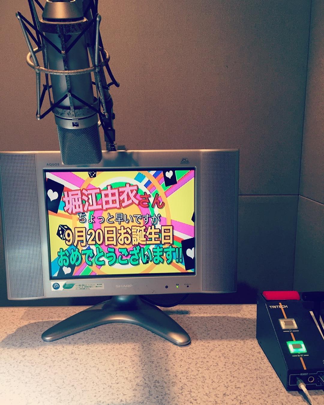 お誕生日のメッセージ、たくさんいただきました♪ ありがとうございます♪本当に嬉しいです! すずまお荘のスタッフのみなさまにサプライズでお祝いしていただきました♪ ナレーションをしようと思ったら、画面に突然このメッセージが…♪ #yui_horie#堀江由衣Horie YuiYui Horie