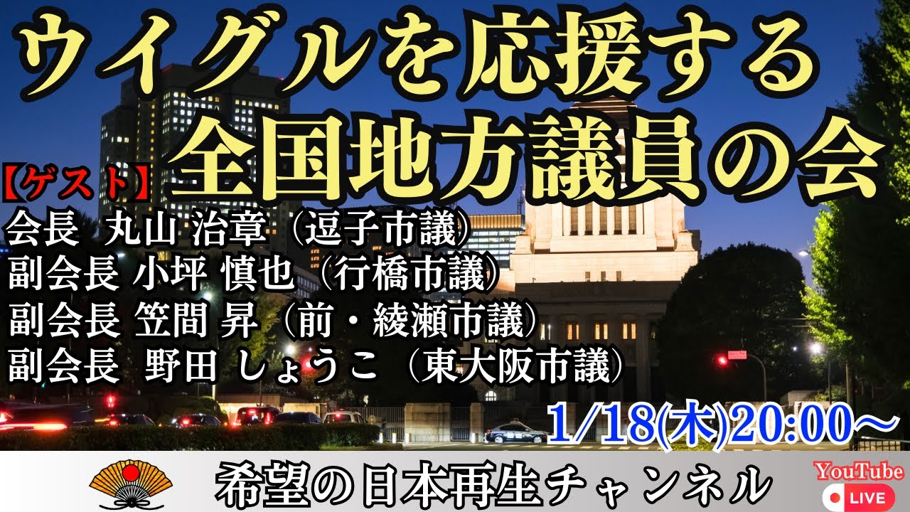 ますはいありがとうございますいやね4期 4期連続当選っていうのもこれもすごい ですけど やっぱり野田先生もあの議題でもねすごく こう質問とかガンガンされるしねえはいえ いやもうこれだけまある意味東大阪市幸せ だ幸せだなと思うんだけどでもねなかなか こう無所属で頑張って頑張り通し てらっしゃるうのがまたねすごいですよね ありがと本当にありがたい本当に私を応援 してくださる本当の表本当にご信いただい てる方々のおかげだともう1番思ってる 議員 です はいそれでもあのはいお言葉すごくよく わかりますはいあ野良先生だったらそう だろうなて思えるもんいやいやもう あまだまだ至りませんあの素敵な仲間に 恵まれてるもうそこは私本当に幸せだと 思っておりますねえはいありがとうござい ますありがとうございます あのま今日こうして丸山会長そして笠副 会長そしてまた野田副会長にご出演 いただいて実はこさんからもう是非え希望 チャンネル出ていただいてでえお話を いただきたいというまごご推薦をいただき ましてえ今回あのゴ無理を申し上げまして ごいただくことになりました本当に頃から 礼申し上げます うあのいろんな普段もあるいはいろんな あなんだろうもうこの問題が本当に微妙な 問題であるだけに極労もたくさんおわりに なるんじゃないかという風に思いますまた 誹謗中傷といったようなことも盛に行わ れるんですよねうん えまつい戦だっても訴えてやるなんていう 風なことがまX上にうん囲まれたりなんか し ていましたけれどもでも えっとまそういう中にありましてえ最後に ですね あと今後の活動としてどのようなことをお 考えになってらっしゃるのかえま先生から お伺いしてもよろしいでしょうかはいあの 今後のウイグルを応援する全国地方議員の 会のあの活動といたしましてはえ今まで あの証言集会というえまウイグル人の方に え地方に来ていただいてま自分がどういう 目に合っているのか家族がどういう目に 合ってるのかっていう話をしていただく 証言集会というものをま立ち上げてやって きておりますで3つ柱があるんですけども 証言集会はそのうちの1つでもう1つは 該当活動なんですねえ地方議のいる駅に 最寄りの駅に行きましてそこであのま