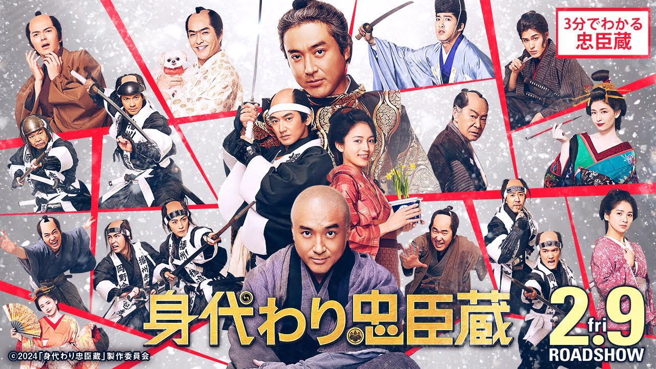 2月9日公開の身代わり中心グ室強し長山 へ得た川口春奈など豪華なキャスト人で 描く時代劇エンターテイメントムービーが 開幕公開に先立って中心裏とは何かああ 解説 解説中心裏とは江戸時代中期に起こった 実話を元にした小説や歌舞伎の演目などで 今もなを語り継がれる有名なお話 ですある時のこと犯の殿様麻野巧の神が 江戸幕府の家臣木孝の助を江戸城いわゆる 電柱で切りつけるという大事件が起きまし たなぜ切りつけたのか麻野は幕府から天皇 を迎え接待をするという大変な仕事を受け ていましたそこでその仕事に詳しいキラが 礼儀を教えるとして選ばれたのですしかし このキラという男大変意地悪な人6に敷 たりを教えず麻野に恥をかそうと嫌がらせ をしていました耐え続けていた麻野は怒り が 爆発怒りのあり電柱で刀を抜くという最大 のご発を破りキを切ってしまったという わけです争い事があった時は喧嘩という 制度で2人とも罰を受けることになってい ましたが武を命じられたのは麻野のみキは 何の音もありませんでした家臣たちも領地 を没収され失業してしまいましたこれに 対し家臣のリーダー大石倉之助は怒り浸透 君麻野の敵討ちのため平の首を取ることに 決めました大石47名の家臣たちは水面下 で準備を進め麻野の命日でもあった原15 年12月14日の未名に平手へ攻め入り ましたキの用人棒を倒し平の首を取ること に成功見事片を果たしたの ですこれが俗に中心裏の話 ですそんな中心裏の物語を元に超性格の 悪い兄幸之助の代わりに顔はうり2つなが 性格が全く違う弟高明が身代わりをしてい たらどうなるのかという基礎天外な設定で お届けするのが2月9日に公開の映画 身代わり中心ぐら金なしやる気なし人望 なしの生草坊主がいきなり大人様に本来敵 だったはずの大石倉之助ともまさかの教頭 のなきけの家臣に偉人な使用人とのラブ ストーリーも突然大人様の身代わりとなっ た主人公高明は周りからばれずにおを守る ことはできるのか 大エンターテイメントとなったシグラ特 ご覧 あり殿は先ほど切られましたキはお 取り潰しになるやもしれません殿にけてキ をお守りくださいやってやるか誠にキラで あるか生きていますピンピンしています 打ちしかない大石倉之助 ですこんなところで喧嘩は 仲直り友様が何やら親しで赤の武士の一分