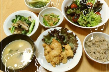 @小田あさ美 @小田あさ美 2016.04.02 @小田あさ美: 小田飯♡ 鶏ささみの唐揚げ 茸と小松菜のソテー ピーマンのなめ茸和え チョレギサラダ 豆腐とわかめのお味噌汁 玄米 いただきました( ^ω^ )… …