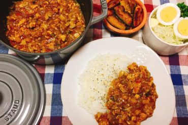 @朝香りほ @朝香りほ 2017.11.30 @朝香りほ: プレゼントで頂いたstaubを使って 無水キーマカレー作り . たまにレシピ知りたいと コメントいただくので簡単に きのこトマト玉ねぎひき肉コンソメを入れて無水… …
