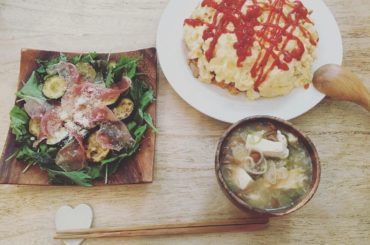 @堀絵梨子 @堀絵梨子 2016.06.27 @堀絵梨子: 朝ごはん ズッキーニソテーと生ハムのサラダ チーズインオムライス なめことお豆腐とたっぷりおねぎのお味噌汁 どうしてもお味噌汁が飲みたくて笑 オムライスの卵は… …