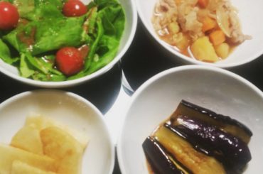 @小田あさ美 @小田あさ美 2015.08.06 @小田あさ美: 小田さん家の夜ご飯 肉じゃが 茄子の揚げ浸し 長芋のわさび醤油漬 サラダ菜とトマト お味噌汁 玄米 いただきます #肉じゃが #女子力 #家庭的なご飯を作… …